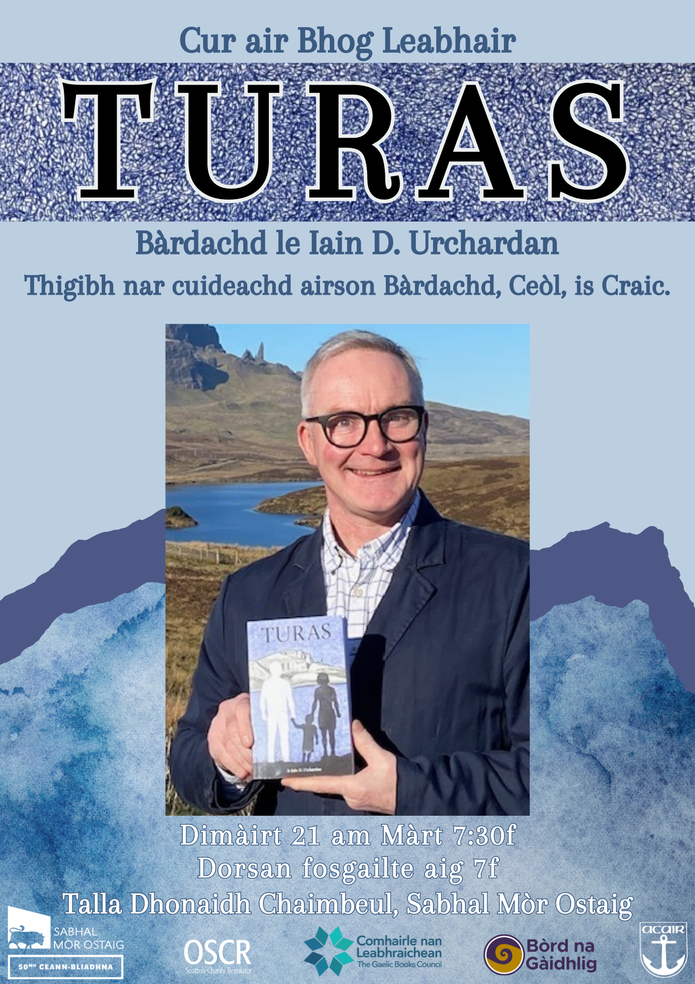 A’ cur ‘TURAS’ le Iain Urchardan air bhog 13Màrt 2023Add a comment Chì sibh an seo fiathachadh gu cur-air-bhog “TURAS”, an leabhar ùr aig Iain Urchardan. Thèid a chumail aig Sabhal Mòr Ostaig, ann an Talla Dhonaidh Chaimbeul, air Dimàirt 21mh am Màrt, aig 7.30f. Thigibh ann! Co-roinn seo: Click to share on X (Fosglaidh seo ann an uinneag ùr) X Click to share on Facebook (Fosglaidh seo ann an uinneag ùr) Facebook 'S toil 'Ga luchdadh... Co-cheangailte